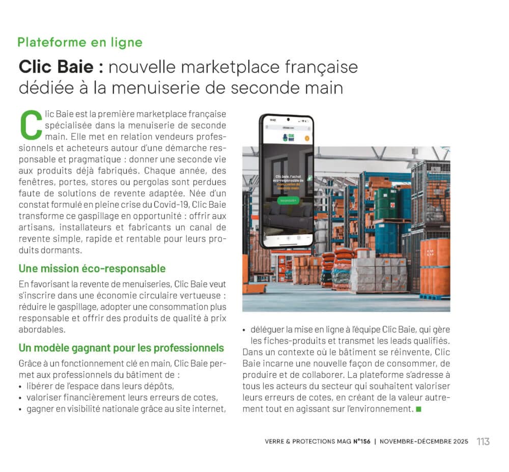 CLIC BAIE franchit une nouvelle étape dans son développement à l’échelle nationale : la marketplace française dédiée à la menuiserie de seconde main fait l’objet d’une parution dans VERRE & PROTECTIONS MAG, numéro 156. Cette visibilité dans la presse professionnelle confirme l’intérêt grandissant du secteur pour les solutions de réemploi et d’économie circulaire appliquées au bâtiment, et renforce la crédibilité de CLIC BAIE auprès des acteurs du marché français.